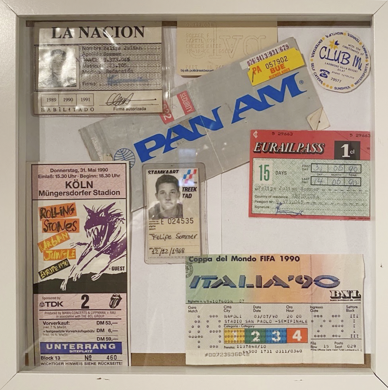 Varios documentos y recuerdos del gran viaje. El pasaje de Pan Am que hacia Argentina, USA, Francia e Israel. El Eurail Pass que usabamos para viajar en tren, las entradas al mundial Italia 90 y al concierto de los Stones en Koln. El Hotel donde trabaje en Eilat y el pase de transporte de Amsterdam.