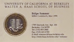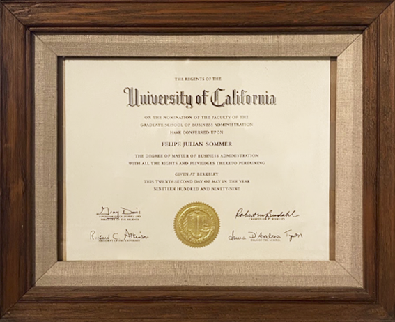 Diploma de MBA de Haas School of Business de UC Berkeley del año 1999. El diploma está firmado por Laura Tyson quien fue la presidenta de Council of Economic Advisors de Clinton entre 1993 y 1995.