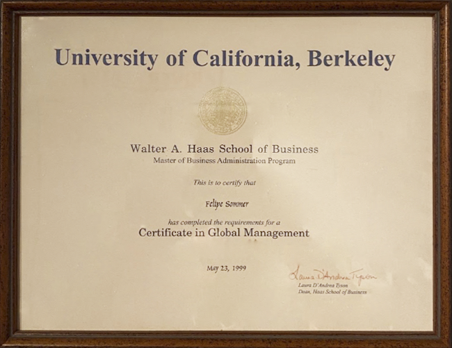 Certificado de Global Management de Haas School of Business de UC Berkeley del año 1999.